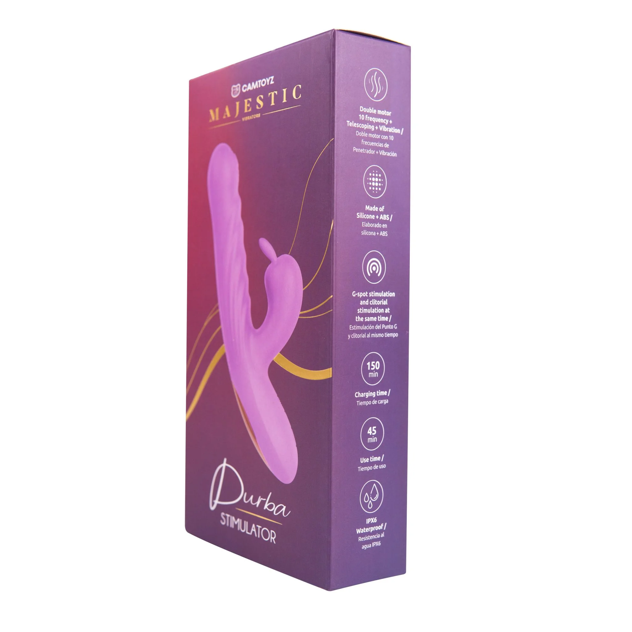 De la prestigiosa línea Majestic, este vibrador lila de doble estimulación ofrece una experiencia única. Con un diseño exclusivo y un par de orejitas dedicadas a la estimulación del clítoris y pezones, Durba es el camino hacia momentos de éxtasis.